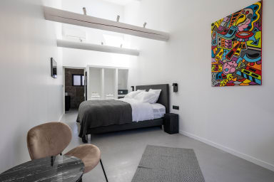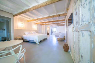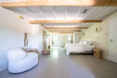 In the main building, the four bedrooms are arranged as suites, each featuring a super king-size hotel bed (2x2m) with premium bed linen.
